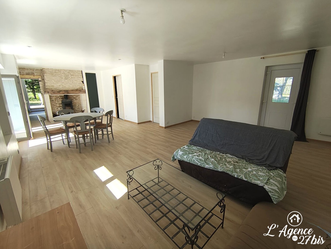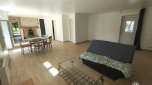 Elle se compose au rez de chaussée d'une cuisine aménagée et équipée avec accès direct à la terrasse par une baie à galandage, un salon séjour lumineux avec poêle à bois, un WC et une salle d'eau.